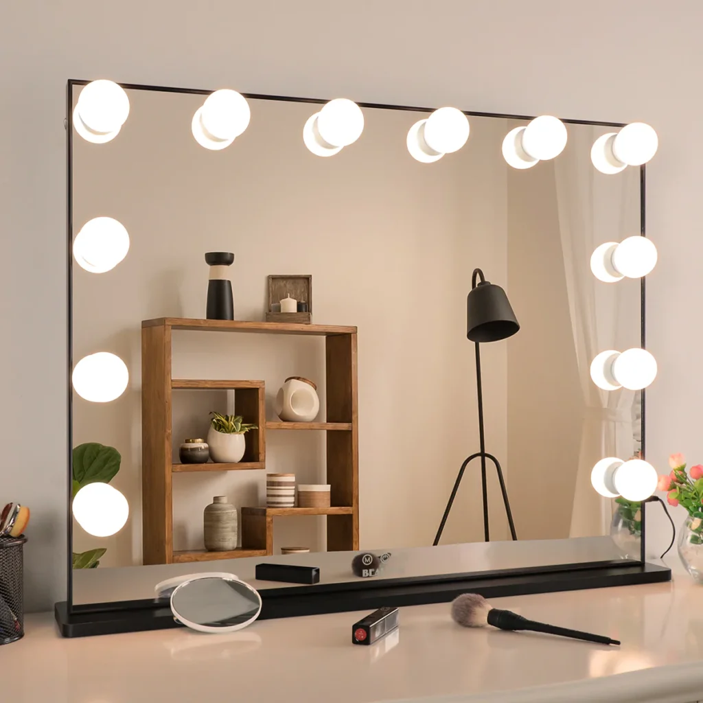 This makeup mirror is small and portable. A good companion for traveling.It comes with soft, natural LED lights and is adjustable by a touchscreen button. With a folding bracket that can tilt 180 deg, it allows you to adjust the proper angle.